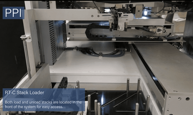 Demonstration of a tray removal and reload in a ProVia FP-UC dual CO2 and UV laser drilling system.